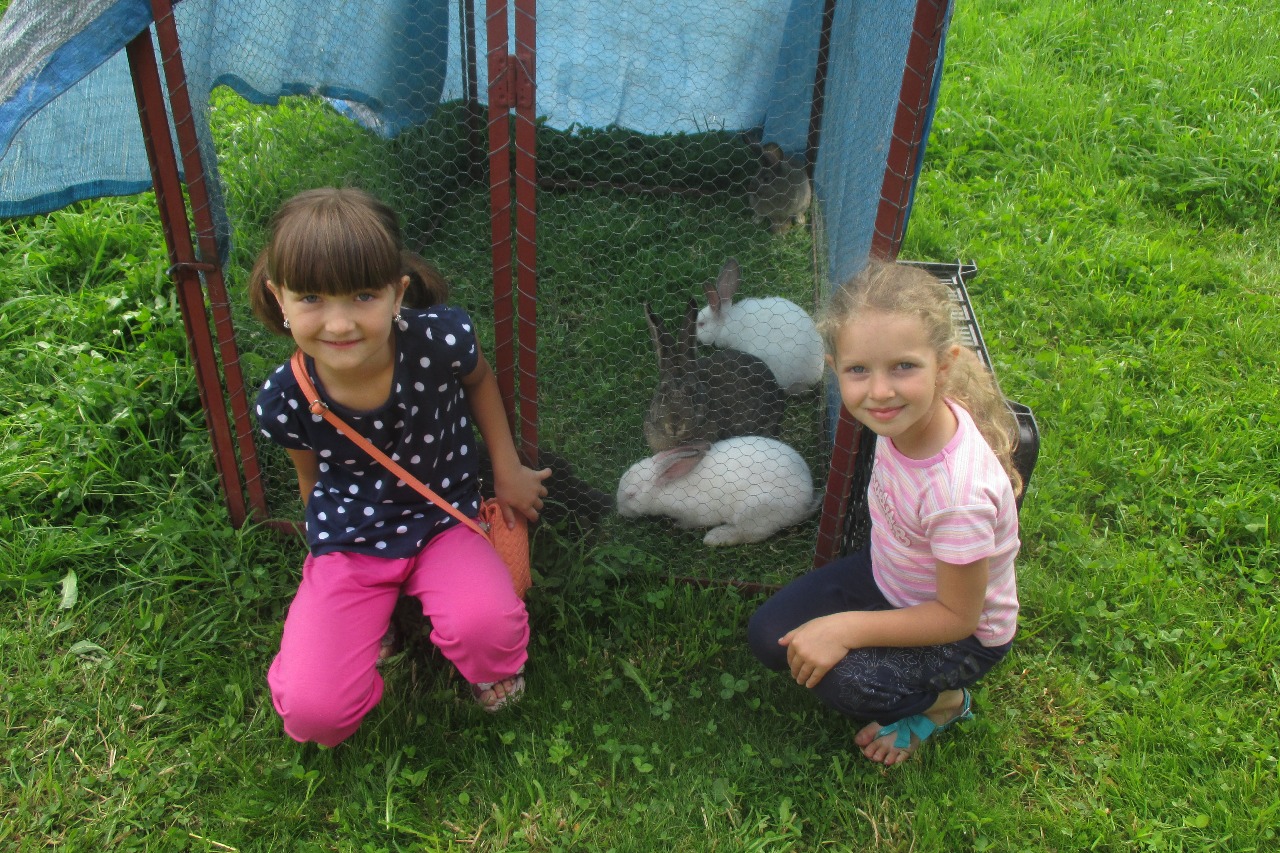 Menší holky velmi zaujali králíci domácí, kteří se na zahradě pásli ve svém výběhu. Holky neváhaly a odvážně k nim do jejich klece vlezly. My větší jsme oprášili gumu a vzpomínali, jak se přes ni vlastně skáče.